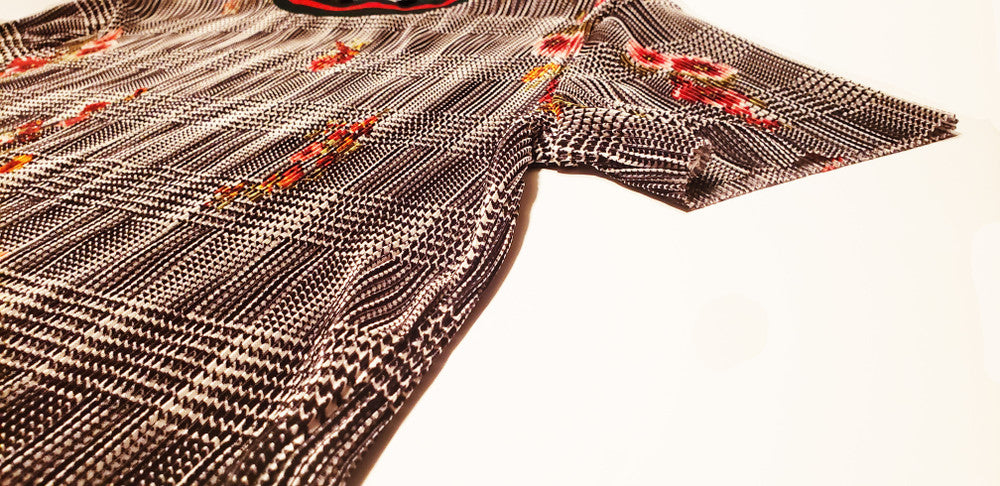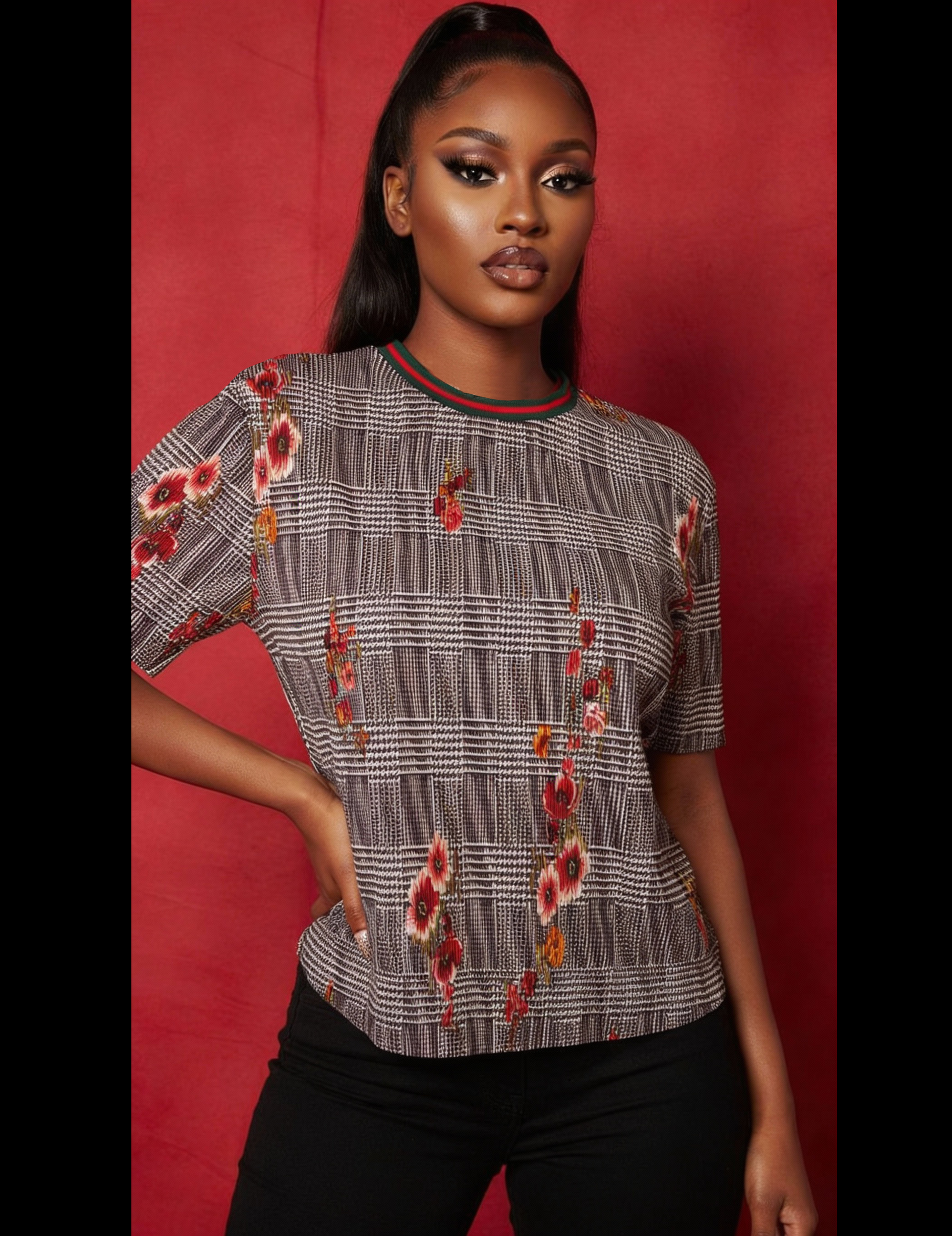 This textured short sleeve floral printed top features a sporty varsity striped designer inspired neckline; pair it w/ denim cutoffs & sandals for a laid back look or dress it up w/ a skirt & booties for an edgy night look!