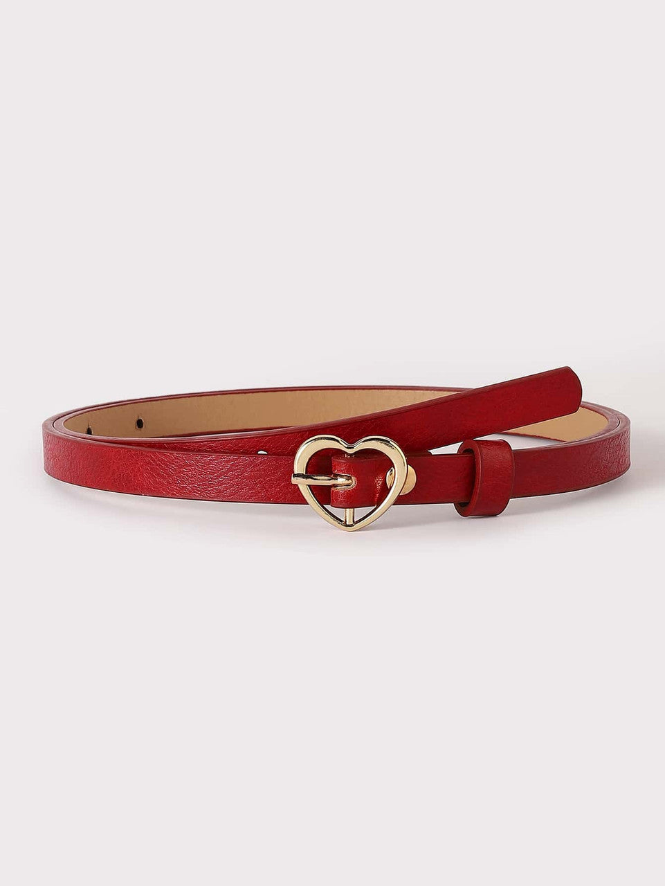 This patent textured burgundy red belt features a fun silver heart buckle!